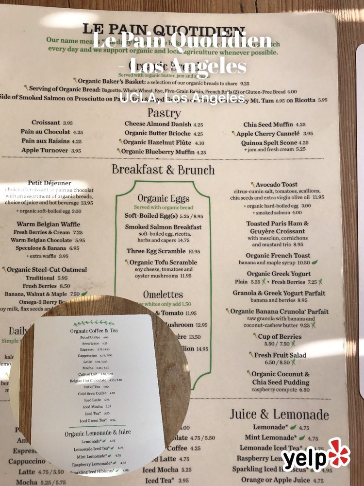 Le Pain Quotidien in Los Angeles offers a cozy ambiance perfect for brunch or casual meals. With a diverse menu including the new Baked Organic Eggs Flatbread and Roasted Veggies & Feta Flatbread, there are plenty of delicious options for everyone. The cafe also serves a variety of hot teas, coffees, and refreshing beverages. Customer reviews praise the quality of the food and the friendly service. Whether you're craving a savory breakfast sandwich or a sweet Belgian waffle, Le Pain Quotidien has something for everyone. Don't miss out on their signature dishes like the Mushroom Gruyere Quiche or the Smoked Salmon Omelette. This spot is a must-visit for those looking for a charming atmosphere and delectable food options in Westwood.